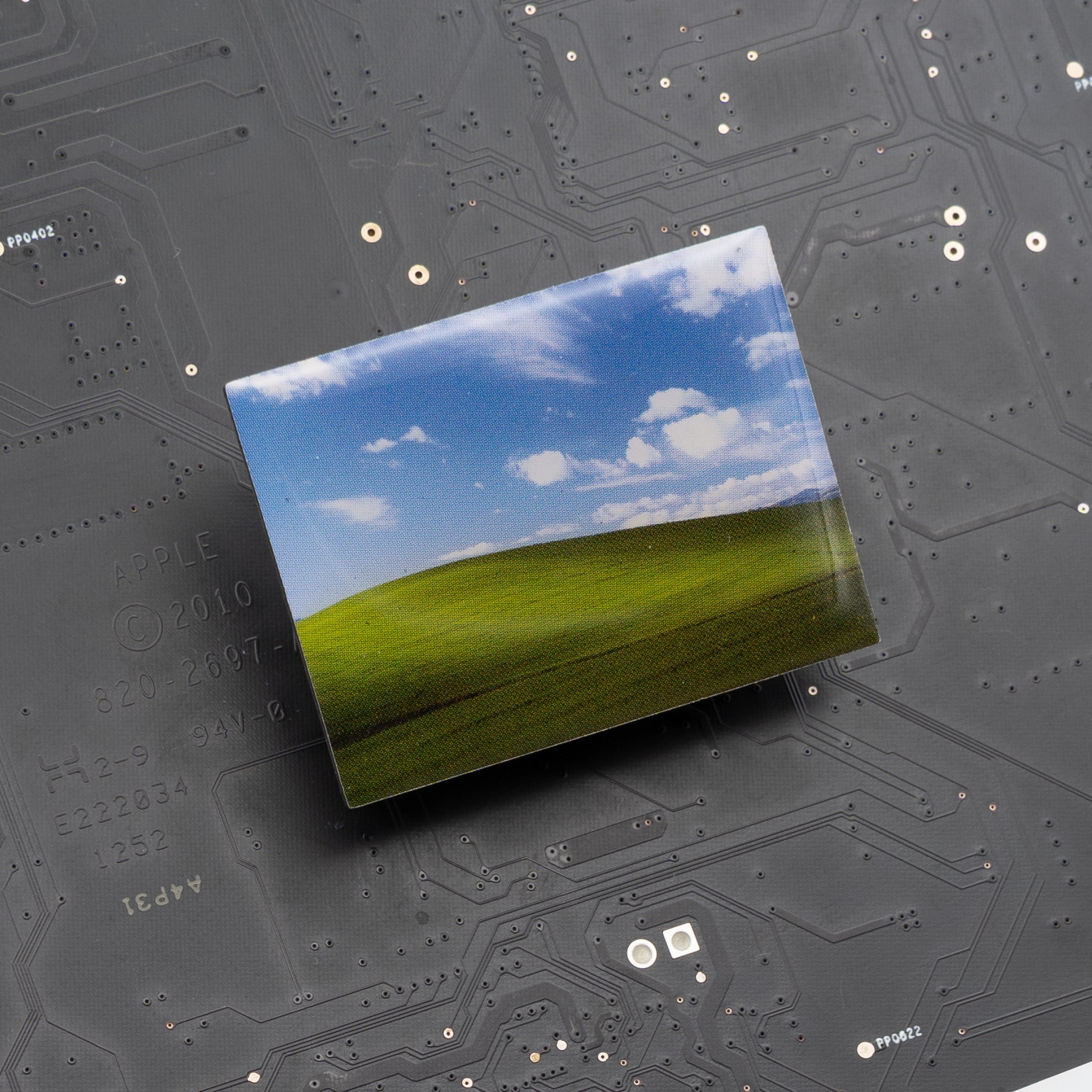 Rolling green hills. Blue sky. Peak early-2000s desktop energy. This pin recreates the legendary default wallpaper image that lived on millions of screens and became a genuine pop-culture landmark. It’s CMYK printed (not UV) and sealed under a glossy dome, giving it that crisp “freshly installed OS” shine.
